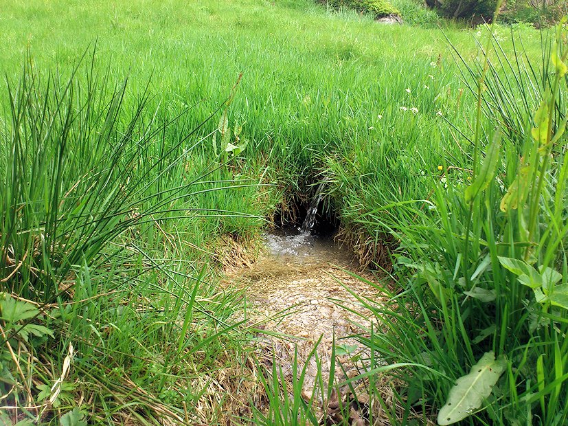 Srpen 2025 - studánka aktuálně neteče, suchá trubka je v trávě obtížně dohledatelná. Nachází se jen několik metrů od potůčku, který protéká podél plotu sousedního pozemku, a při pohledu od křížové cesty je skryta za keřem v dolíku. Aktuální foto: Martin Mlečka