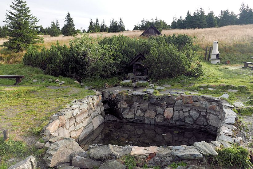 Pramen vedle nejstarší turistické chaty v Jeseníkách z r. 1887.